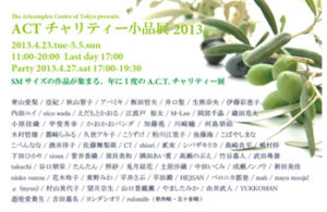 本展は、毎年The Artcomplex Center of Tokyoにて開催されているチャリティー展です。これまで、売上の一部をBe Good Cafeの行う「オレンジプロジェクト」へ寄付をしてきました。 今年は昨年に引き続き、2011年3月11日に起こった東北太平洋沖地震の影響による被災地へ、売上の一部を寄付いたします。